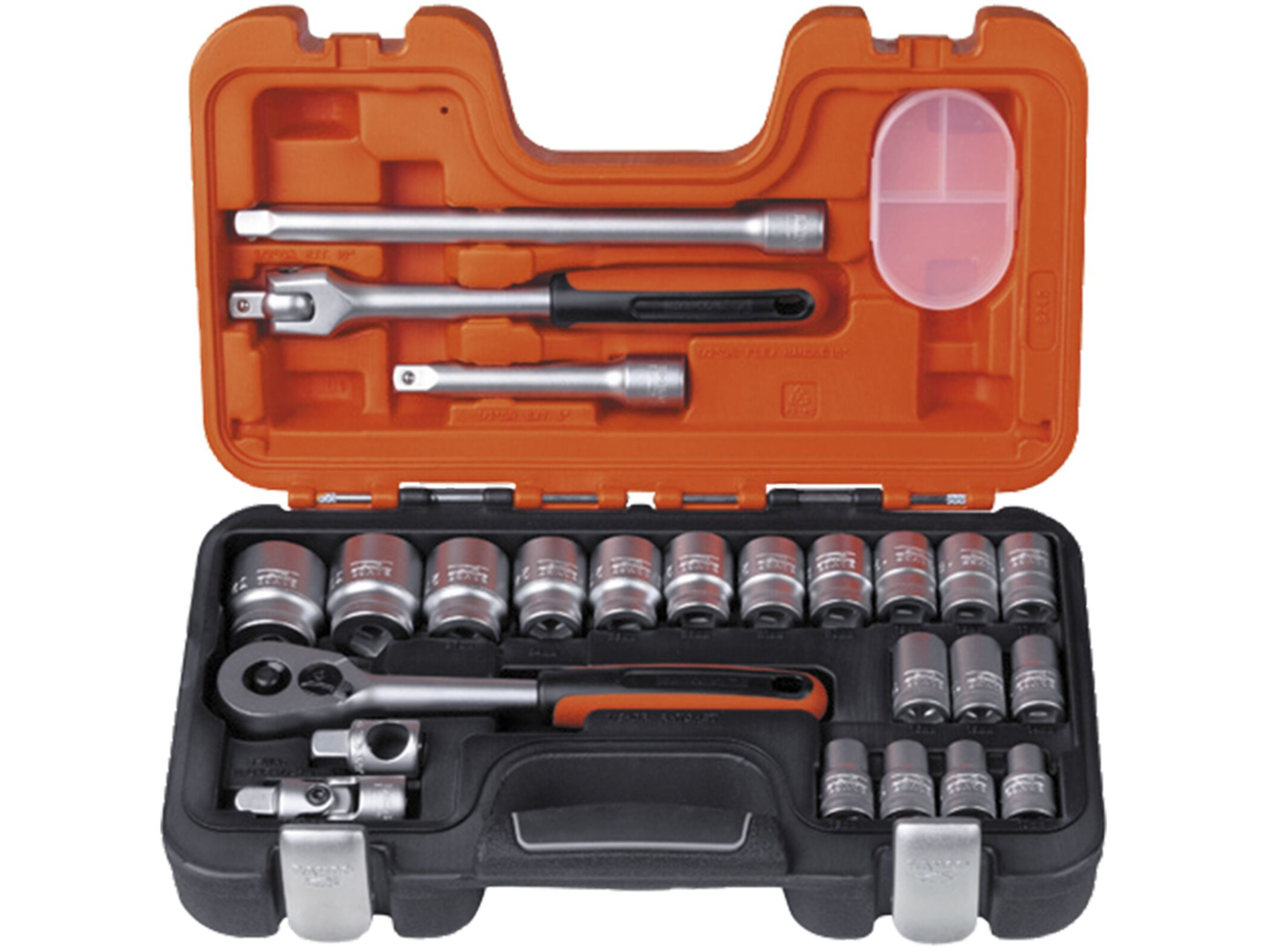 1/2" topnøglesæt. Højtlegeret stål. Matforkromet. ISO 1174. DIN 3120. Kuffert i slagfast, olie- og temperaturbestandig plast. Indeholder 24 dele. 18 stk. 1/2" sekskanttoppe: 10, 11, 12, 13, 14, 15, 16, 17, 18, 19, 20, 21, 22, 23, 24, 27, 30 og 32 mm. 1 stk. 1/2" skraldenøgle med to-komponent håndtag, 60 tænder og 6° arbejdsvinkel. 2 stk. 1/2" forlængere 125 og 250 mm. 1 stk. 1/2" kardanled. 1 stk. 1/2" t-nøglehoved. 1 stk. 1/2" ledhåndtag 250 mm med to-komponent håndtag. 1 stk. udtagelig 3 rums opbevarings plastboks med låg.