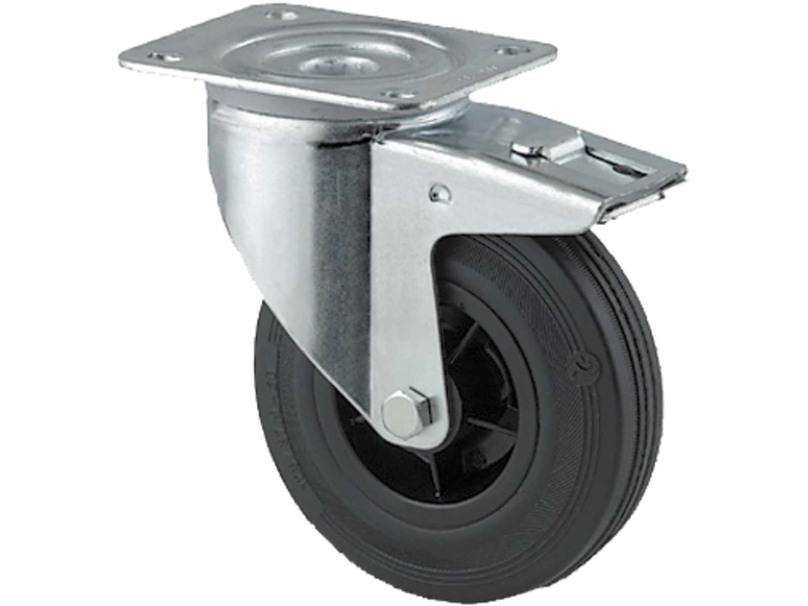 Drejeligt hjul med bremse, 200 mm, sort massiv gummi, rulleleje, plade, 200 kg