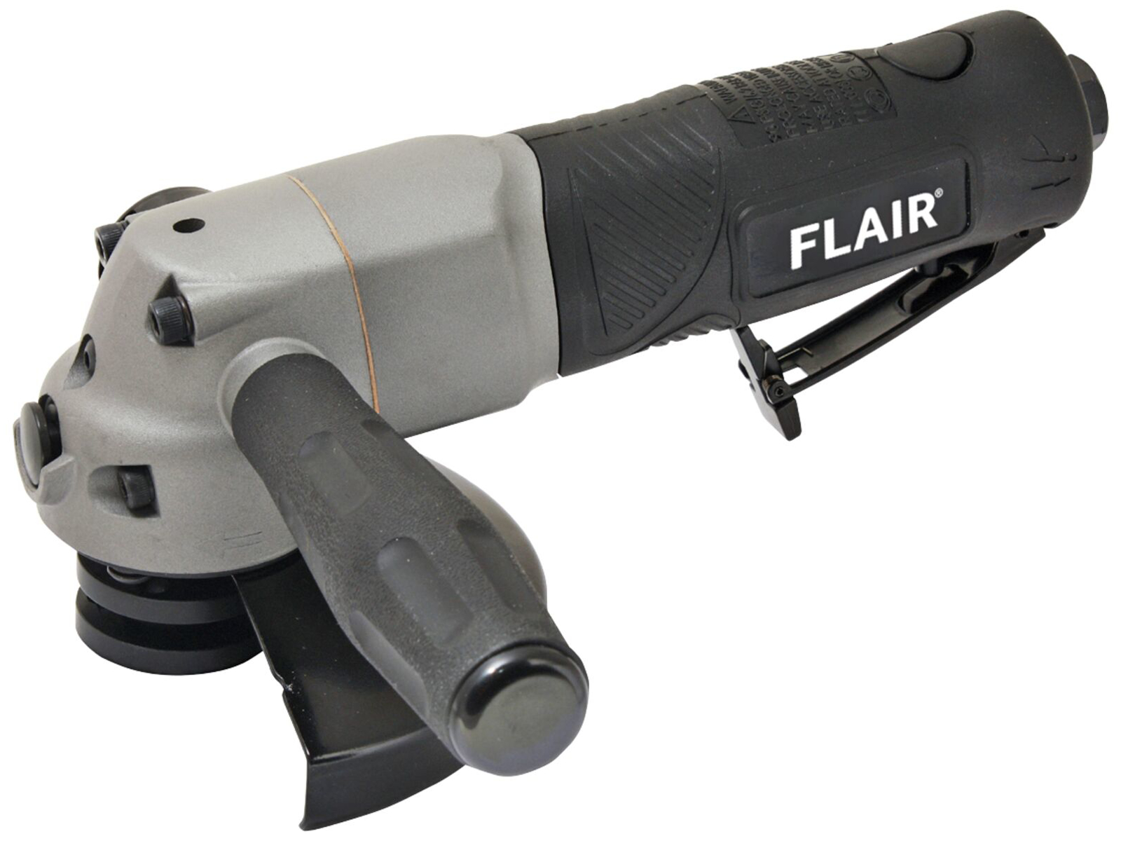 125 mm vinkelsliber med M14 spindel til direkte optag af børste eller skive. Spindellås til hurtigt skiveskift. Sidehåndtag kan monteres i højre eller venstre side. Drejeligt afgangsluft fremme i højre side. Type: Heavy duty. Model: FLAIR. Udformning: Vinkel. Lydniveau: 86 dB. Vibrationsniveau: 1,0 m/sek2. Vægt: 1,8 kg. Længde: 232 mm. Min. slangetilslutning: 3/8". Max. arbejdstryk: 6,3 bar. Omdrejninger: 11000 omdr/min. Luftafgang: Fremad. Effekt: 0,97/1,3 kW/hk.