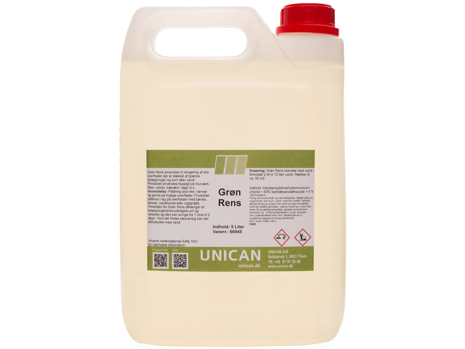Grøn Rens anvendes til rengøring af alle overflader der er dækket af grønne belægninger og som tåler vand. Produktet desinficerer og hæmmer/fjerner mug, svamp og jordslag på indkørsler, overflader af både træ og beton herunder kælderrum. Produktet anvendes hyppigt på murværk, fliser, sokler, træværk, tage m.v. Anvendelse: Påføring skal ske i tørvejr og gerne på fugtige overflader. Produktet påføres i lag på overfladen med børste, pensel, vandkande eller rygsprøjte. Virketiden for Grøn Rens afhænger af belægningens/smudslagets art og tykkelse og den kan svinge fra 1 time til 2 døgn. Hvis det findes nødvendig kan der efterskylles med vand. Dosering: Grøn Rens blandes med vand i forholdet 2 dl. til 10 liter vand. Rækker til ca. 50 m2. Produktet kan anvendes til at modvirke statisk elektricitet ved at påsprøjte/afvaske med en 1 % opløsning. Grøn Rens kan også fjerne dårlig lugt fra overflader eller emner, dette gøres med en 0,5 % opløsning. Desuden som desinfektion af overflader, instrumenter, inventar samt afvaskning af køle og fryserum.(0,5 % opløsning)