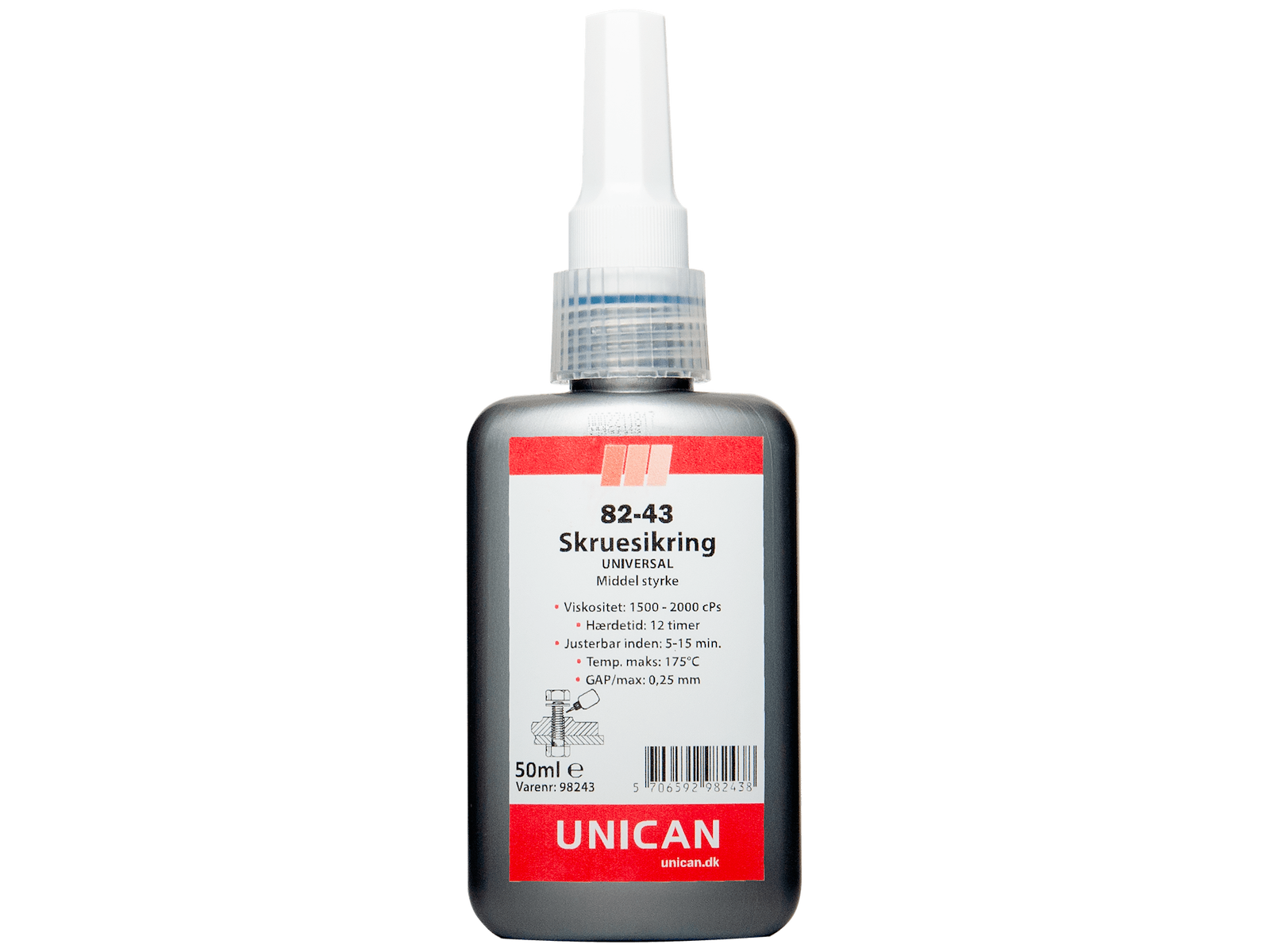 UniTite Låsevæsker anvendes til at forsegle og sikre gevind, skruer, bolte og møtrikker. Låsevæskerne fås i 3 styrker, nemlig let-, middel-, og svær demonterbar. Hærdetiden er 12-24 timer og emnerne er justerbare indenfor 15-60 minutter, afhængig af hvilket produkt der er tale om. Temperatur max: 150°C.