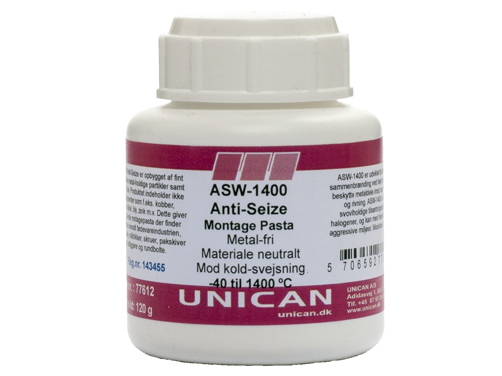 ASW-1400 Metalfri Montagepasta er opbygget af fint-formalet ikke metal holdige partikler, samt medicinsk olie. Produktet indeholder ikke metal-pigmenter som f. eks kobber, aluminium, nikkel, bly, zink m.v. Dette giver en enestående pasta, der finder anvendelse overalt i industrien på bolte, møtrikker og skruer, prespasningssamlinger og pak-skiver samt udliggere og rund-bolte. ASW-1400 er udviklet til at modstå sammenbrænding ved høje tryk og til at beskytte metaldele imod rust, korrosion og rivning. Produktet forholder sig materiale-neutralt ved bearbejdning af højtlegerede stål-typer og andre metal-materialer. ASW-1400 får dele til at holde længere samt nedsætter slitagen. Dette betyder reducering af udskiftningsomkostninger og lettere reparationsarbejde selv efter påvirkning af meget høje temperaturer. ASW-1400 er fri for svovlholdige tilsætningsstoffer og halogener og kan med fordel benyttes i aggressive miljøer. Produktet er NSF-H1 godkendt og kan derfor også anvendes bredt indenfor fødevareindustrien.