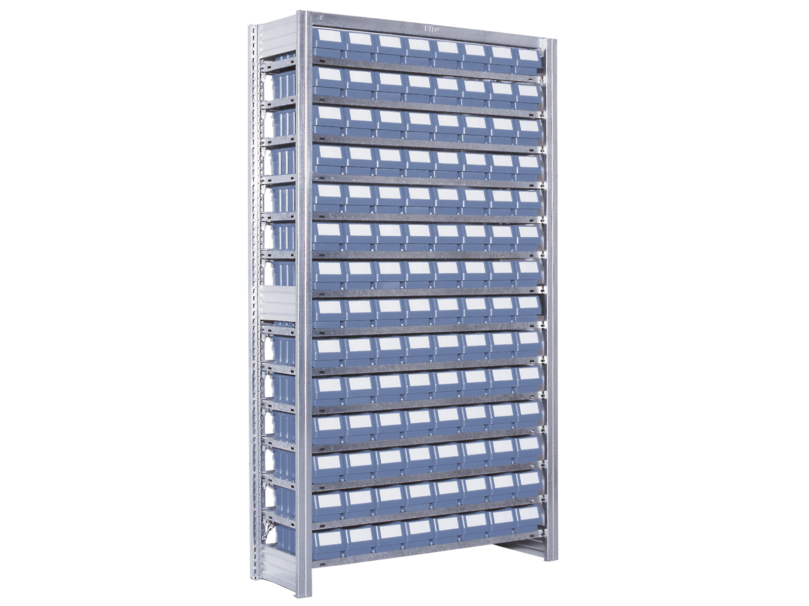 Småvarereol med 112 RK reolkasser. Fås i forskellige størrelser i hhv. grundmodul eller tilbygningsmodul.