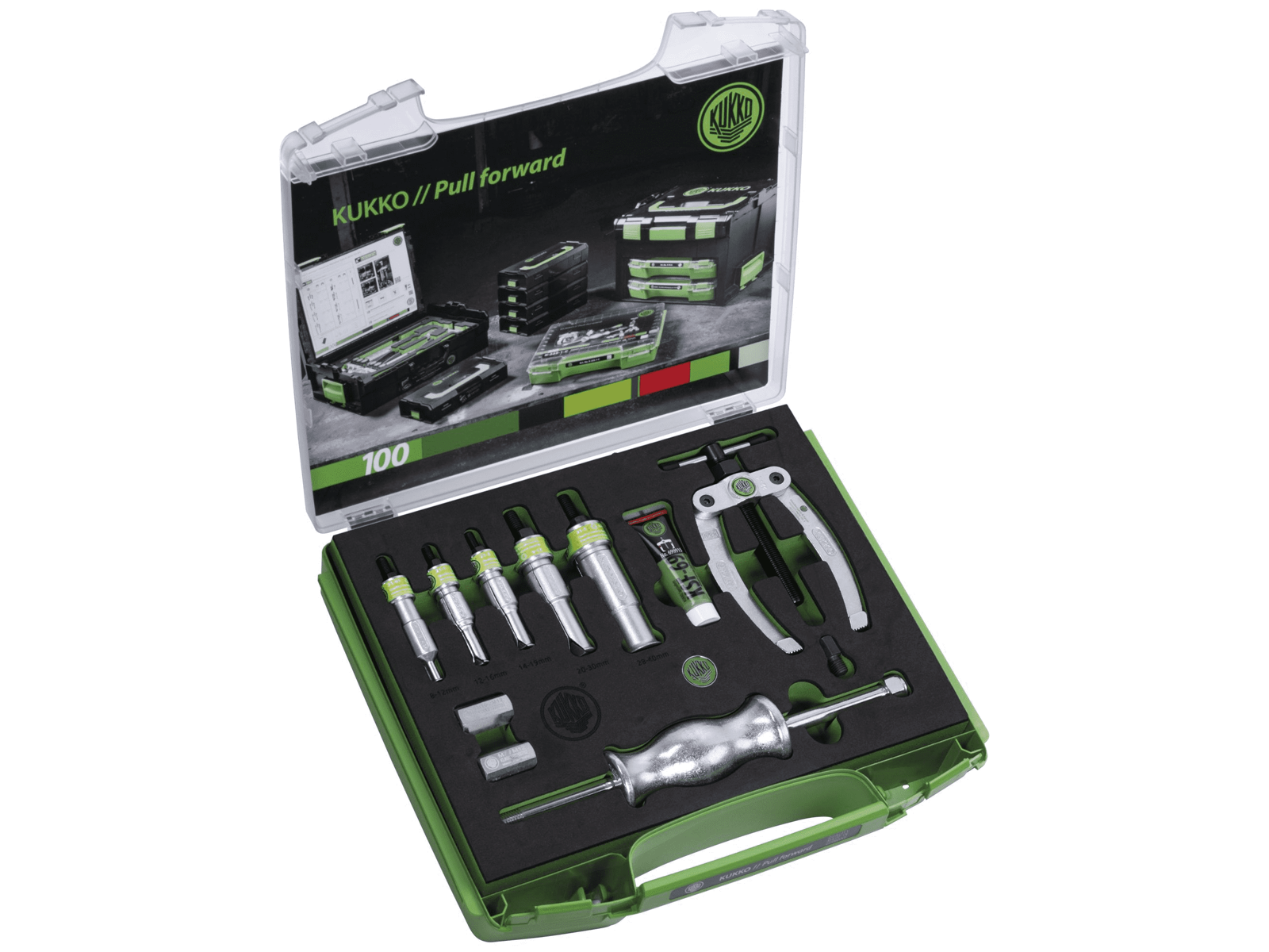 Aftrækkersæt til kuglelejer med modstøtte og glidehammer. Med en spændvidde fra 8 til 40 mm er den indvendige udtrækkers 5 størrelser tilpasset afmonteringen af gængse lejer, lejeyderringe og bøsninger på automotive-området og er dermed universelt anvendelig. Hvis det ikke er muligt at anvende modstøtten pga. de eksisterende pladsforhold, har sættet en tung glidehammer med henblik på høj aftrækningskraft. Inden for rammerne af Kukko-byggeklodssystemet kan modstøtten og glidehammeren desuden kombineres med indvendige segmentudtrækkere, nålelejeudtrækkere, gevindstifter etc. og suppleres efterfølgende. Modstøtternes arme kan nemt indstilles som følge af en indvendig fjedring (størrelse 1 til 3). Den 2-armede udførelse af den indvendige udtrækker med ekstra store gribekanter muliggør sikker udtrækning. De indvendige aftrækkere har en indvendig stødsikring mod overspændings-og overbelastningspåvirkninger. De indvendige udtrækkere fra Kukko kan kombineres med både modstøtter og glidehammere. Næsten alle komponenter kan leveres som reservedele, tidsbesparende bestilling vha. nummerering.