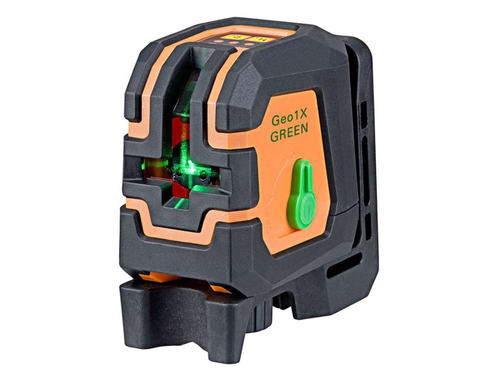 Geo1X krydslaser er en letbetjenelig laser med grønne laserlinjer, som gør den tydelig og nem at se. Denne krydslaser er ideel til brug ved indendørs nivelleringsopgaver. Én lodret og én vandret laserlinje som kan danne et laserkryds . Selvnivellerende funktion kan låses til manuel brug. Ekstra lang rækkevidde på 70 mtr. med modtager (tilkøb). Nøjagtighed ±3 mm/10 mtr. Selvnivelleringsområde ±3°. Alarm hvis uden for selvnivelleringsområdet. Robust gummihus i klasse IP54. 5 timers driftstid. Funktionsbeslag med magneter på bagsiden, skruehul og stativgevind 1/4" og 5/8". Levers med væg/stativbeslag, 4× AA alkaline batterier og blød taske.