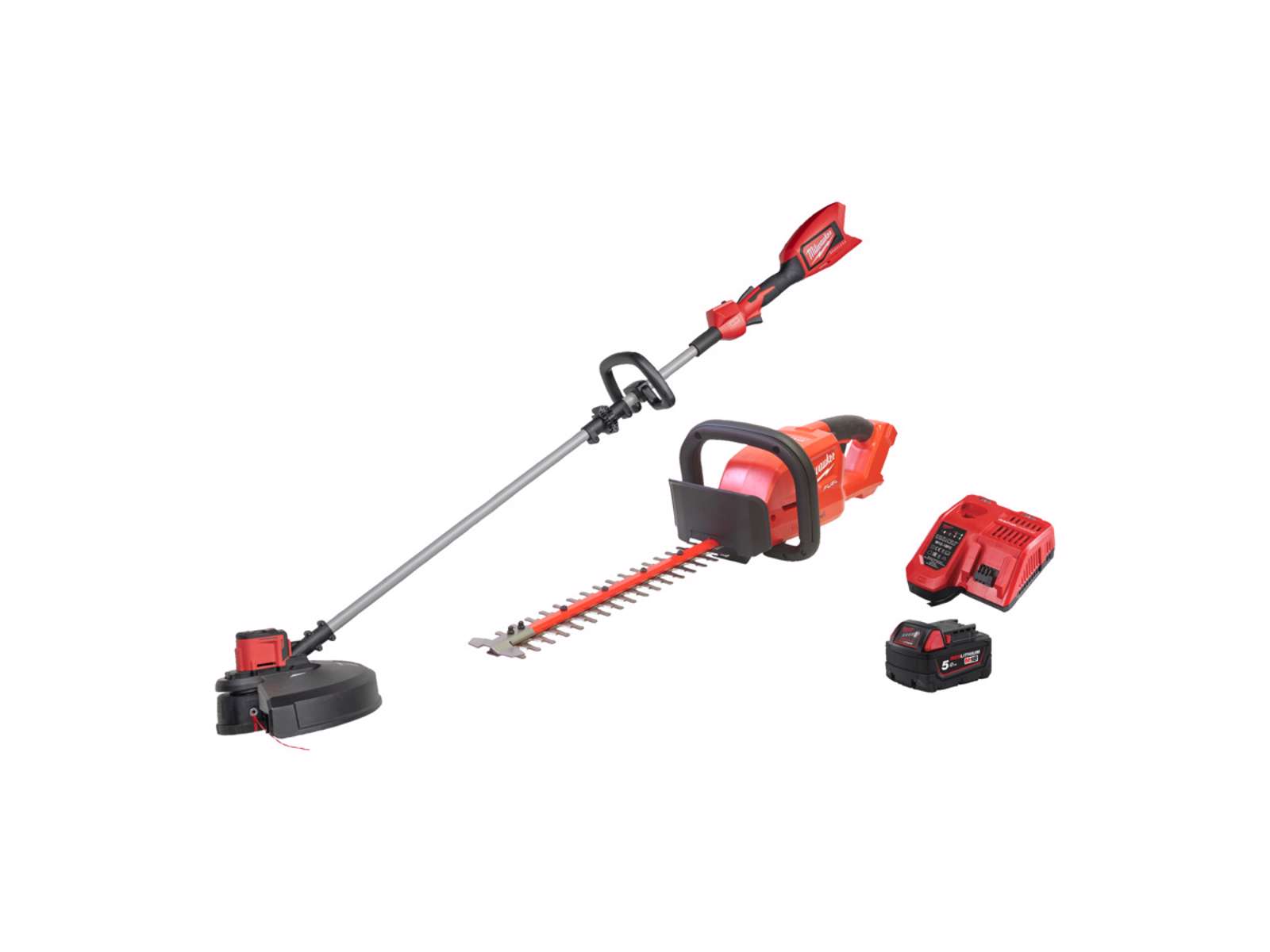 M18 PowerPack med Fuel løvblæser, brushless græstrimmer, 5,0 Ah Redlithium batteri og 59 min. hurtiglader.