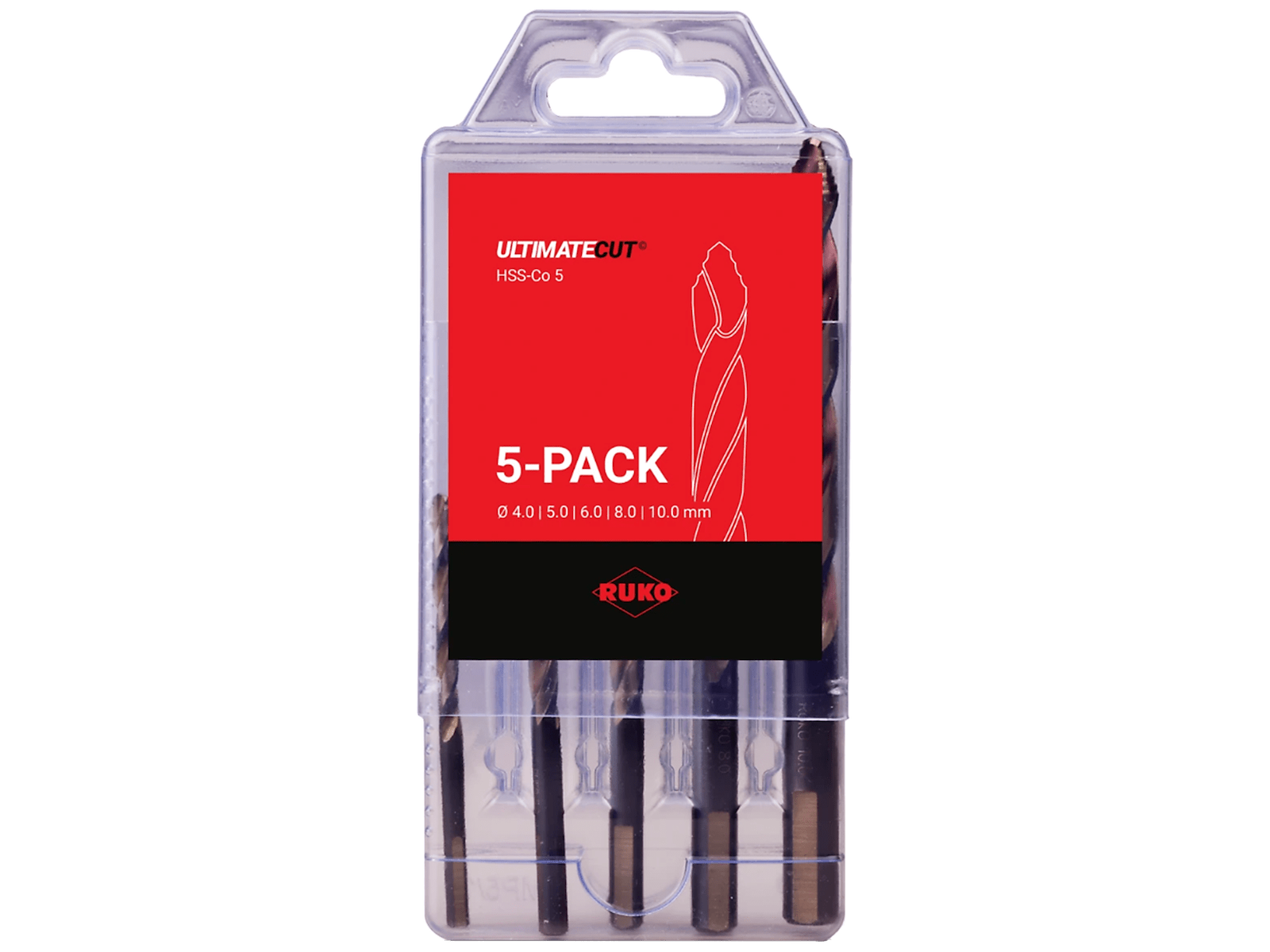 UltimateCut spiralborsæt til boring i bl.a. rustfri samt syre- og varmebestandigt stål. Flowstep-spids - borer op til 5× flere huller, dobbelt så hurtig som standardbor. Skaft med 3 spændeflader. Sæt med 5 størrelser: 4,0 / 5,0 / 6,0 / 8,0 / 10,0 mm.