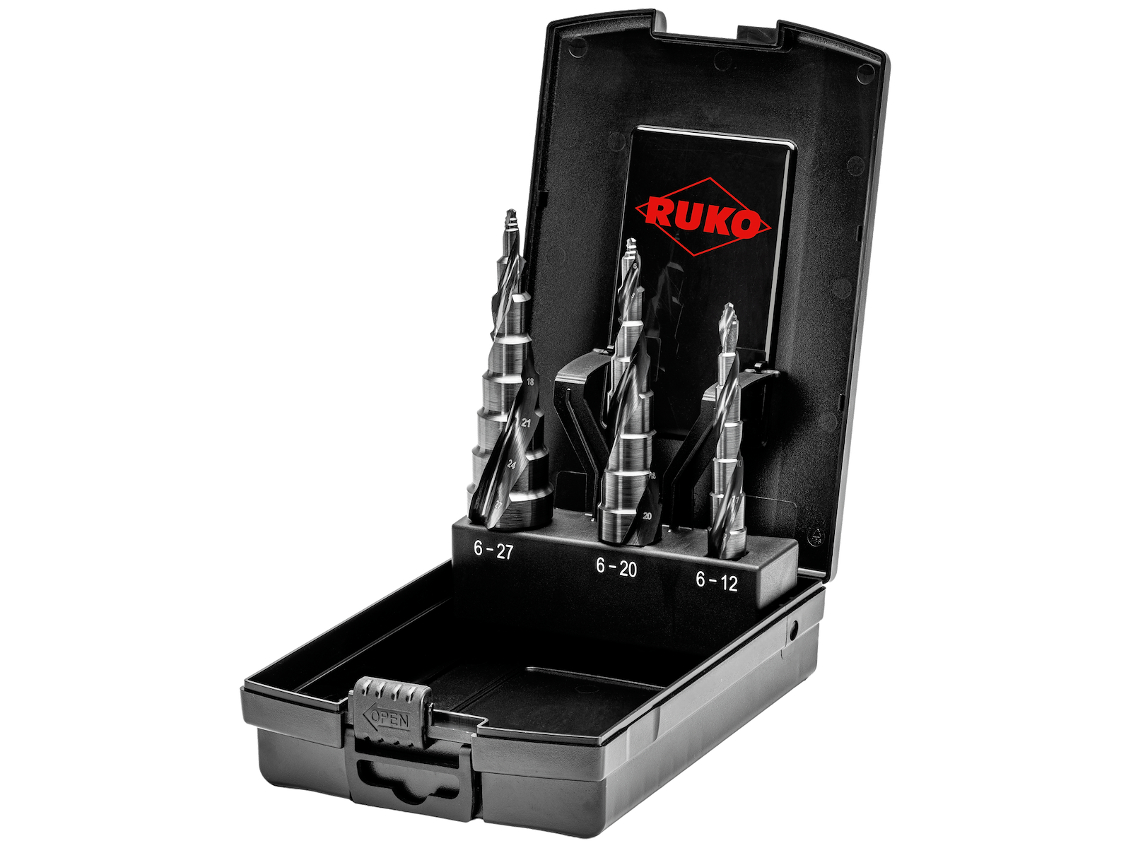 UltimateCut trinborsæt HSS med RUnaTec-overflade til boring i de fleste materialer også rustfri. RUnaTEC overfladebehandling til krævende materialer, såsom hærdet stål, takket være dens kraftige indtrængning i materialet og endnu bedre slidstyrke. Flowstep-spids for flere boringer, hurtigere gennemboring og perfekt centrering - også på runde emner. 10 mm skæredybde. Sættet indeholder: 6-12 mm med 1 mm stigning / 6-20 mm med 2 mm stigning / 6-27 mm med 3 mm stigning.