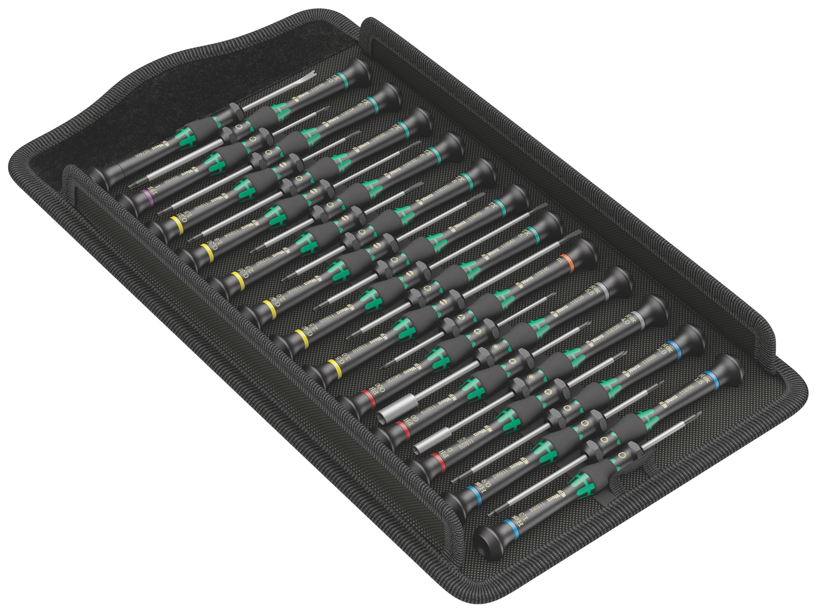 • Kraftform Micro Big Pack elektronik-skruetrækkersæt med 25 dele. Flerkomponent Kraftform Micro greb med præcisionszone direkte ovenfor klingen, kraftzone med integrerede bløde zoner for overførsel af store løsnings- og spændingsmomenter, og hurtigdrejezone nedenfor den drejelige kappe for lynhurtig snurren rundt. Black Point spids garanterer lang brugstid for spidsen, forøget korrosionsbeskyttelse og eksakt pasform. "Take it easy"-værktøjsfinder: Farvemærkning efter profiler og størrelse. Sekskantet rullestop forhindrer skruetrækkeren i at rulle væk på arbejdsstedet. Sættet indeholder: Philips: PH000 × 40 mm / PH00 × 40 mm / PH0 × 40 mm, Torx: TX5 × 40 mm / TX6 × 40 mm, Torx med holdefunktion: TX5 × 40 mm / TX6 × 40 mm / TX7 × 60 mm / TX8 × 60 mm / TX10 × 60 mm, Torx Plus IPR: 1IPR × 40 mm, inhex: 0,9 × 40 mm / 1,3 × 40 mm / 1,5 × 60 mm / 2 × 60 mm, ligekærv: 0,23 × 1,5 × 40 mm / 0,3 × 1,8 × 60 mm / 0,35 × 2,5 × 40 mm / 0,4 × 2 × 60 mm / 0,4 × 2,5 × 80 mm / 0,5 × 3 × 80 mm, topnøgle: 4 × 60 mm / 5,5 × 60 mm, Microstix: m × 40 mm, remover: 1 × 3,5 × 50 mm. Leveres med praktisk rack/holder til opbevaring.