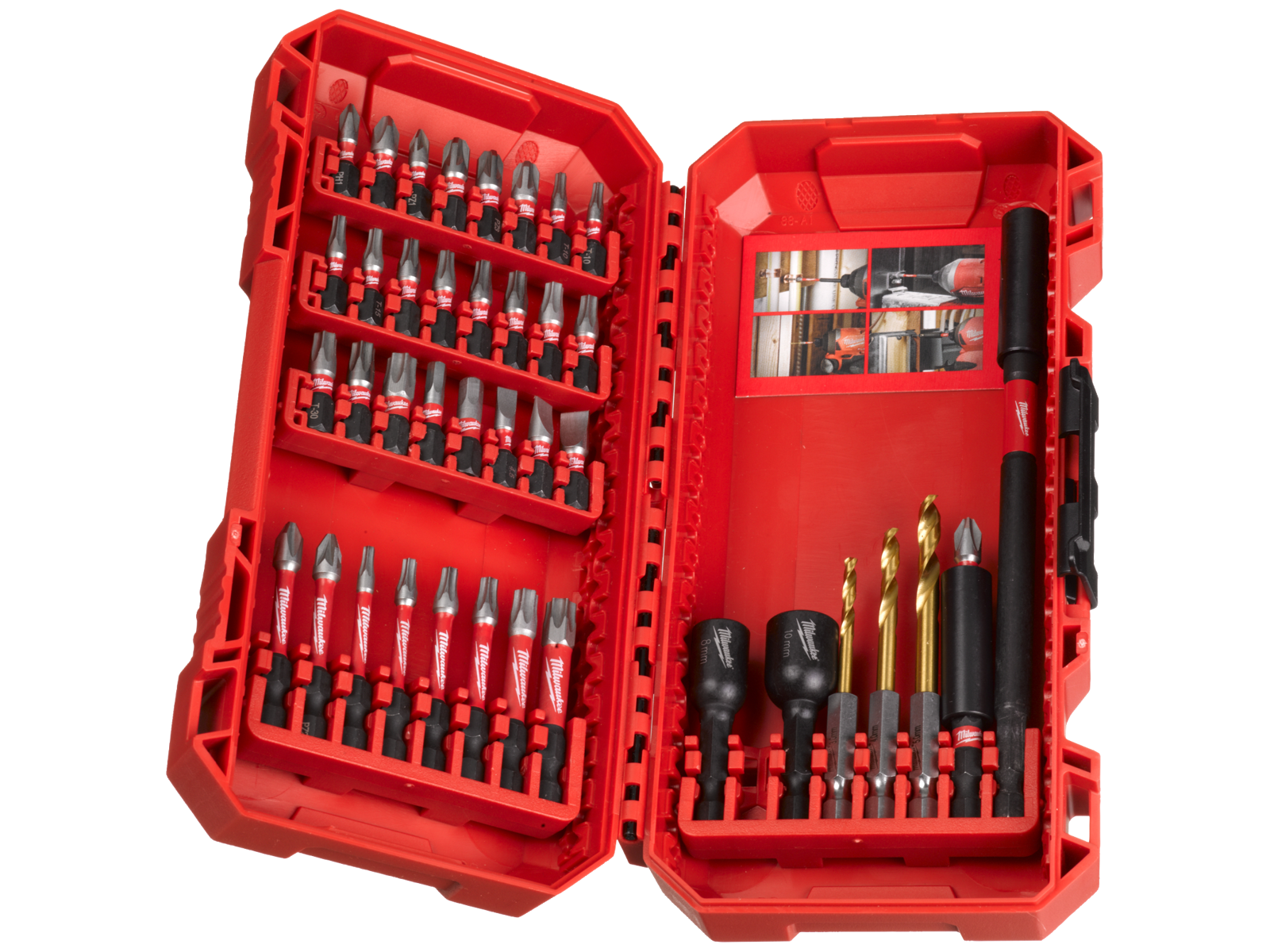 Shockwave Impact Duty slagbitssæt med 40 dele. Serien er ikke kun ideel til heavy-duty opgaver med slagskruemaskiner, men en komplet løsning til enhver bore- og fastgørelsesopgave. Shock Zone geometri for maksimal fleksibilitet: reducerer spidsens belastning, hvilket resulterer i færre brud. Kombinationen af Shock Zone designet og den specielle varmebehandling absorberer slag og tillader bitten af bøje på en lignende måde som fx en fjeder. Smedet spids for ekstra lang levetid og optimal tilpasning i skruehovedet som sikrer, at bitten ikke glider og skruer over gevind. Indeholder: Shockwave skruebits: 25× 25 mm længde 1× PH1 / 2× PH2, 1× PZ1 / 3× PZ2, 2× TX10 / 2× TX15 / 3× TX20 / 3× TX25 / 2× TX30 / 1× TX40, 1× Hex 4 mm / 1× Hex 5 mm, 1× SL 0,6 × 4,5 / 1× SL 0,8 × 5,5 / 1× SL 1,2 × 6,5 - - - 8× 50 mm længde 1× PH2, 1× PZ2, 1× TX10 / 1× TX15 / 1× TX20 / 1× TX25 / 1× TX30 / 1× TX40 - - - Shockwave magnetisk bitholder: 1× 60 mm længde, 1× 152 mm længde - - - 3× Shockwave 1/4" Hex borebits: ø3 / 4 / 5 mm - - - 2× Shockwave magnetiske møtrikspænder: 48 mm længde 1× Hex 8 mm / 1× Hex 10 mm.
