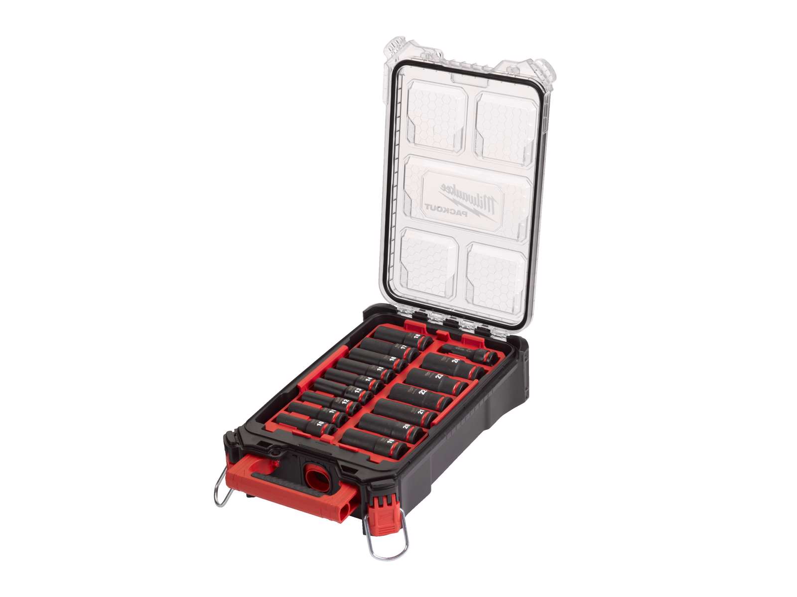 16 x ½″ lange slagtoppe: 10 / 11 / 12 / 13 / 14 / 15 / 16 / 17 / 18 / 19 / 20 / 21 / 22 / 23 / 24 / 75 mm forlænger, 1 x 4932464083 PACKOUT™ kompakt tilbehørskasse