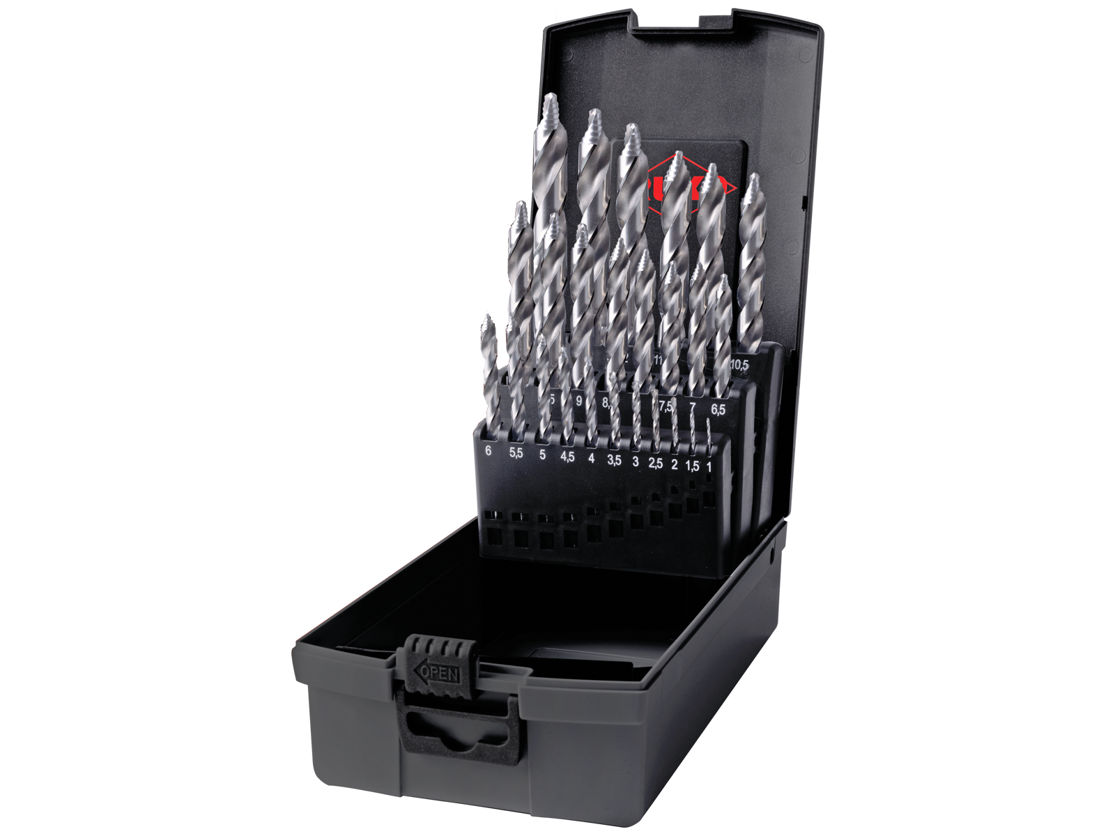 HSS UltimateCut borsæt med 19 stk. spiralbor med Flowstep-spids 1-10×0,5 mm. Op til 5× flere boringer og op til 50 % hurtigere boring.