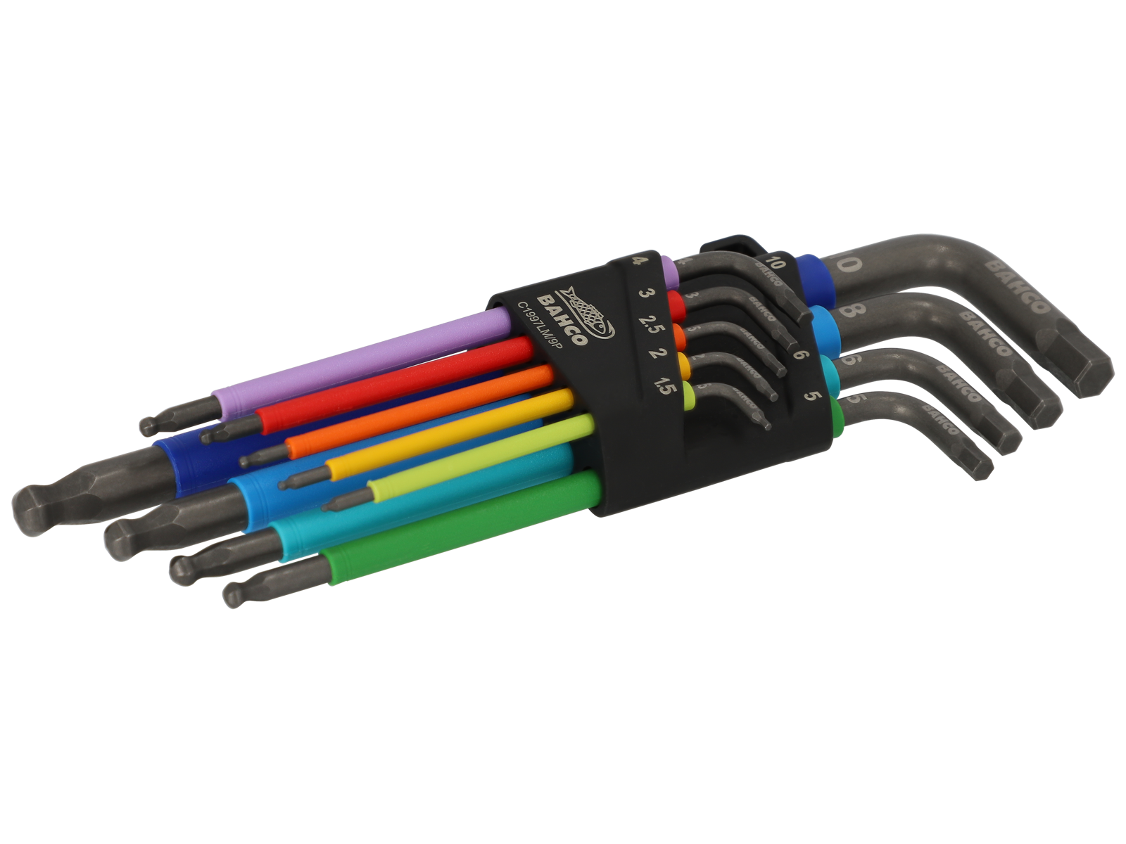 Stiftnøglesæt med 9 metriske, farvede, lange nøgler med kugle: 1,5 - 2 - 2,5 - 3 - 4 - 5 - 6 - 8 - 10 mm. De forskellige farver giver hurtig identifikation af den rigtige nøgle. Lasermarkering af størrelse for hurtig adgang til hver størrelse. Kuglen muliggør arbejde fra flere vinkler, også hvor pladsen er trang. Nøglerne har easy fit-funktion for sikker fastholdelse af nøglerne. Edge plus design med affaset kant giver større overfladekontakt. Sprøjtestøbt greb med soft-touch-fornemmelse giver et behageligt og skridsikkert greb. Højtlegeret stål med fosfateret udførelse beskytter mod korrosion. Praktisk og solid holder med soft-touch fornemmelse.