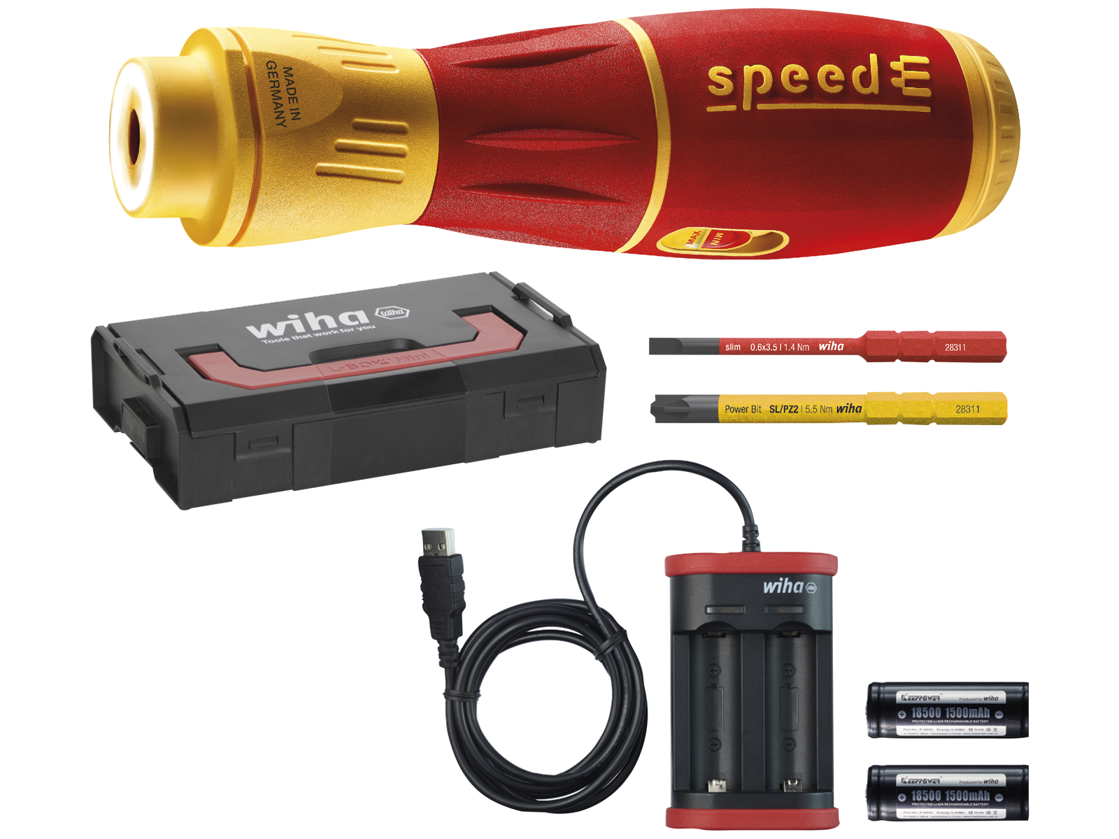 SpeedE II elektrisk bitsskruetrækkersæt med 7 dele: slimBits, batterier og USB-oplader i L-Boxx Mini. 3× hurtigere arbejde takket være det elektriske drev. Ring-LED-lys for maksimal oplysning af arbejdsfeltet. Kompatibel med Wiha Electric Vario Family. SlimBits testet ved 10.000 V AC og godkendt til 1.000 V AC. Der medfølger to bits: 3,5×0,6 mm og SL/PZ2. Perfekt til alle små skrueopgaver.