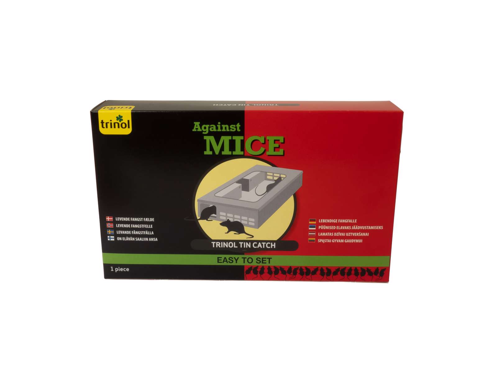 Tin Catch er en levende fangst fælde, hvilket er en human måde at fange mus på. Tin Catch kan lokke og fange 10 eller flere mus samtidig. Læg lokkemad såsom peanutbutter i fælden og placer fælden langs en væg tæt på det område hvor mus eller ekskrementer efter mus er observeret. Tin Catch kræver ikke gift eller kemikalier så den kan bruges omkring børn og kæledyr. Fælden er lavprofil og kan placeres de fleste steder. Oplagt til steder hvor gift ikke er muligt. Tin Catch har et gennemsigtigt låg som gør det nemt at se efter fangst. Levende fangst fælder skal efterses dagligt, gerne flere gange dagligt. Musene skal efter fangst afskaffes ifølge myndighedernes retningslinjer for frigivelse af fangne dyr i naturen. Fælden kan bagefter bruges igen.