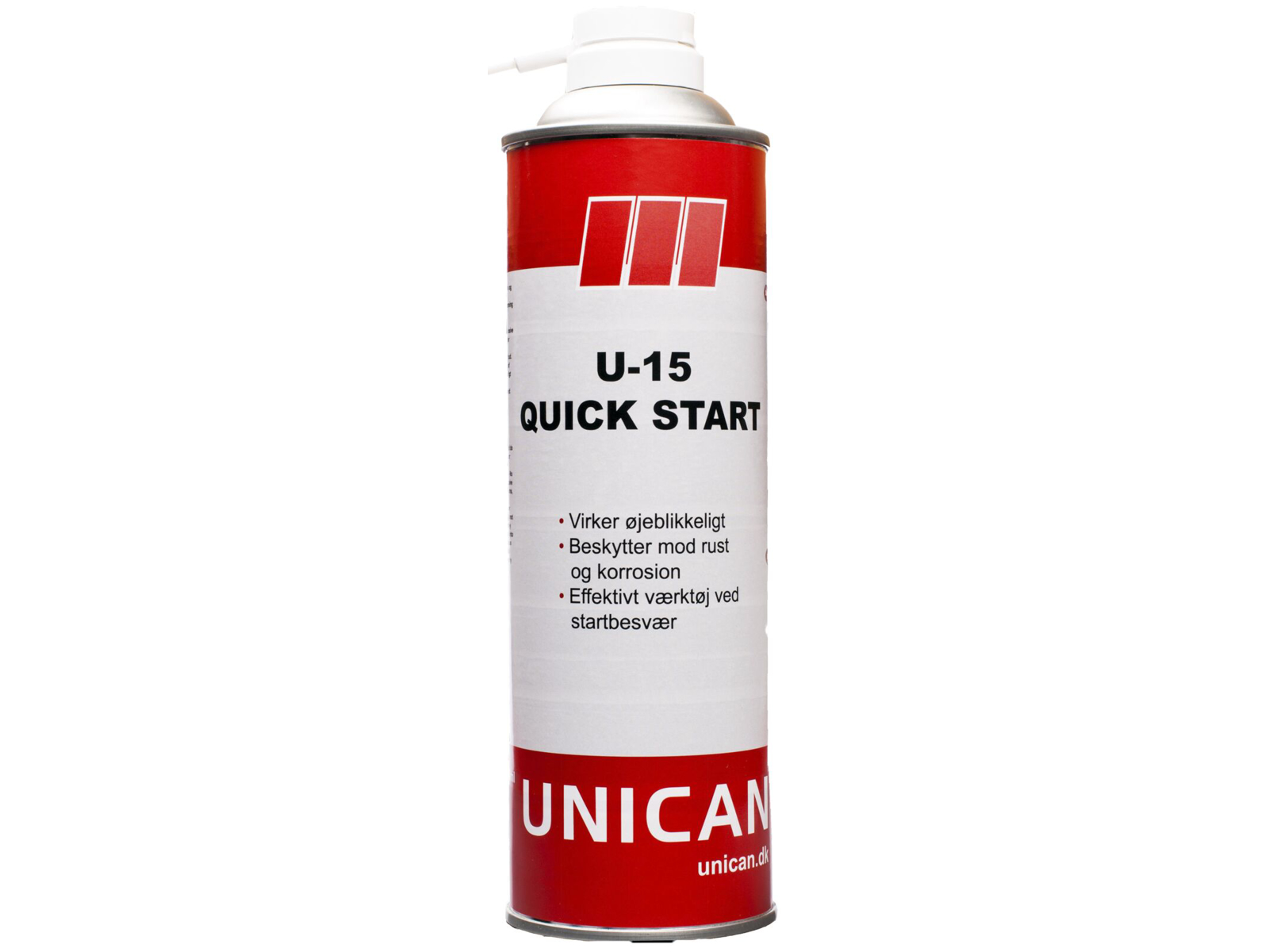 U-15 Quick Start er en yderst effektiv start-spray, som løser start-vanskeligheder på de fleste maskiner og biler. U-15 Quick Start er især velegnet til at løse startproblemer ved brug af maskiner/biler med diesel-motorer. Produktet indeholder en blanding af letantændelige stoffer, som sænker antændelses-temperaturen i motorer, og som derved gør produktet aldeles anvendeligt ved koldstarter og starter af maskiner/biler, som igennem længere tid har stået stille. U-15 Quick Start beskytter ydermere motor, cylindre, stempler m.m. mod korrosion. U-15 Quick Start sprayes direkte ind i indsugningen inden start. Ved ekstremt lave temperaturer kan det være nødvendigt at gentage behandlingen flere gange.