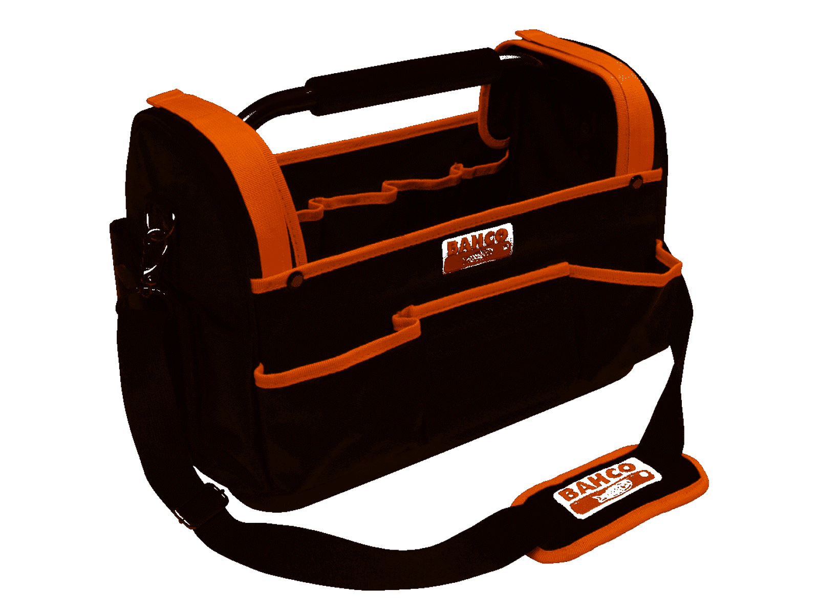 Åben værktøjskasse med let adgang. 10 interne og 11 eksterne opbevaringsrum. Vandtæt bund. Komfortabel bærestrop.