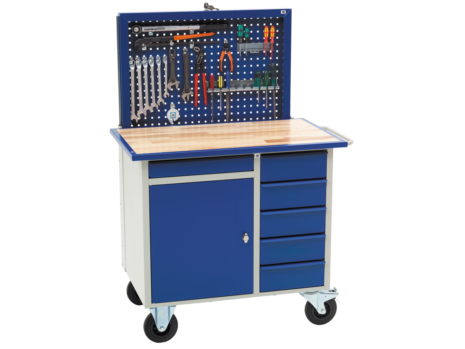 Værkstedsvogn VV-2 med bøgeparket bordplade med stålramme og hjul (2 faste og 2 drejelige med bremse). Leveres med 5 smalle skuffer og 1 bred skuffe samt 1 skabssektion. Alle skuffer er med letløbende rulleudtræk. Skabssektionen leveres med 1 flytbar, galvaniseret hylde, belastning 30 kg. Vognen leveres med centralt låsegreb, forberedt for hængelås og elevatortavle som kan nedsænkes i niveau med bordpladen og er enslåsende med resten af vognen. Belastning pr. skuffe 35 kg. Belastning af hele vognen ved bremset tilstand 1000 kg og i bevægelse 500 kg.