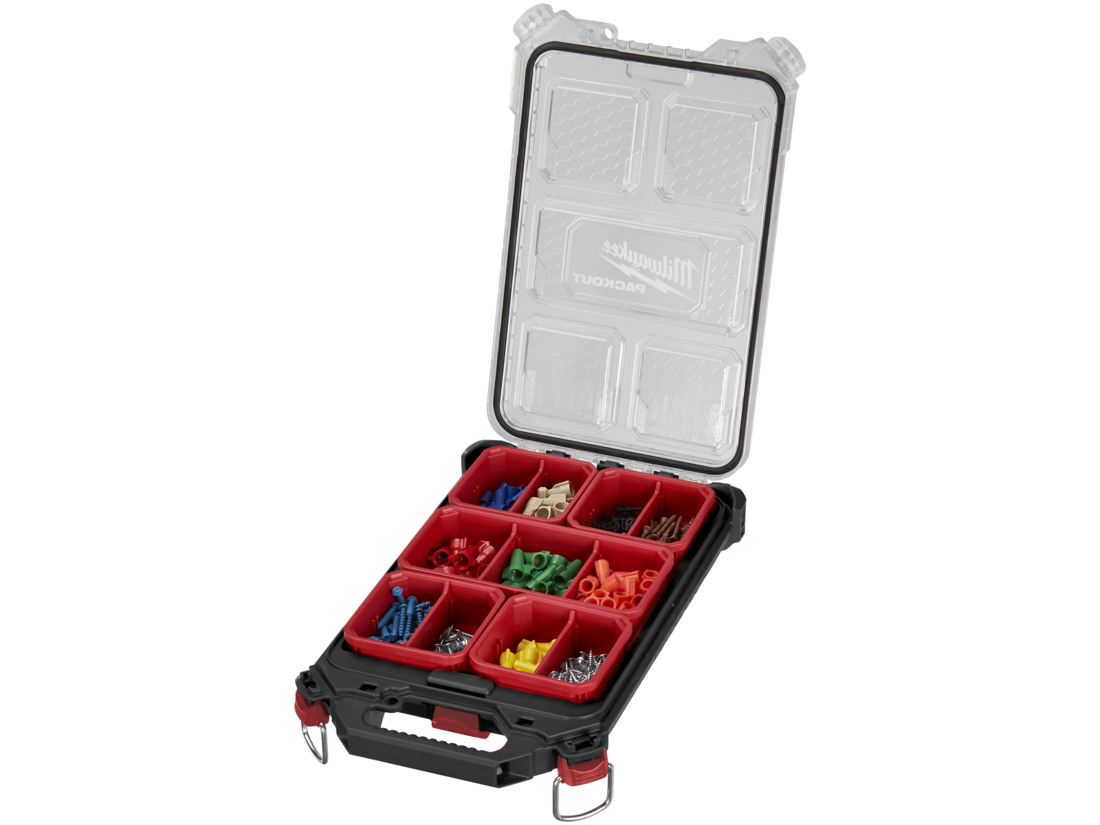 Tilbehørskuffert, som er en del af Packout opbevaringssystemet. Kufferten er konstrueret i slagfast plast for øget holdbarhed og består af store og små beholdere - alle beholdere har opdelere. Beholderne forhindrer indholdet i at blive blandet sammen under transport. IP65-beskyttelse holder regn og snavs ude.