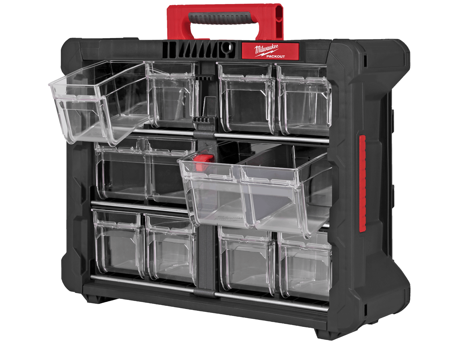 Packout tilbehørskuffert med 8 små og 2 store transparente skuffer. Beholderne kan vippes og tages helt ud. Til opbevaring af småting som skruer, bits, søm, skiver, tuscher og knive. Kufferten er konstrueret af slagfast polymer. Modellen har ergonomisk håndtag, som gør det komfortabelt at bære på modulet. Hænges på vægmonteringspladerne og kan stables på andre Packout-enheder. Tilbehørskufferten er en del af Packout opbevaringssystem.