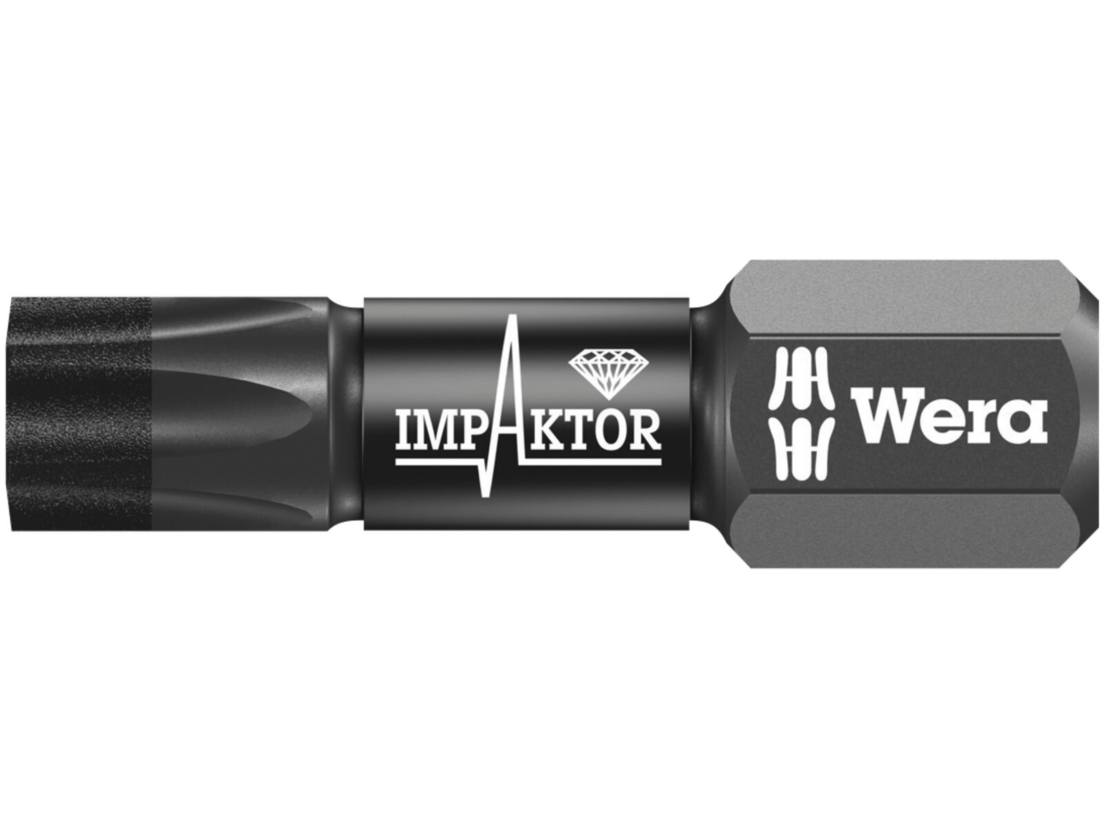 WERA Bits IMP til Torx skruer. Impaktor-teknikken sørger via den bedst mulige udnyttelse af materialeegenskaberne og via optimalt tilpasset geometri for en holdbarhed over gennemsnittet, også når der stilles ekstreme krav, særligt egnet til brug i almindelige impakt-/slagskruemaskiner, den ru diamantbelægning med forøget friktion nedsætter risikoen for at smutte ud af kærven.