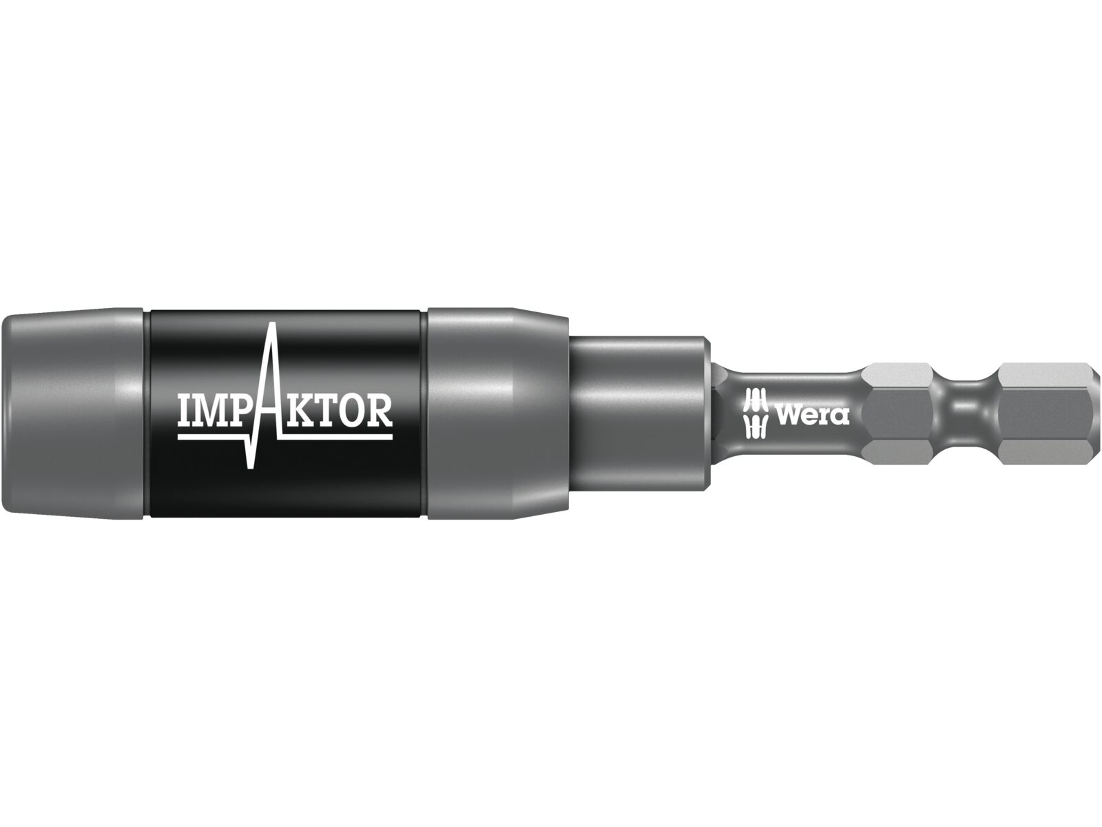 WERA IMPAKTOR bit-holder, til affjedring af ekstreme topimpulser, Impaktor-teknikken sørger via den bedst mulige udnyttelse af materialeegenskaberne og via optimalt tilpasset geometri (to forbundne efter hinanden virkende torsionszoner) for en holdbarhed over gennemsnittet, også når der stilles ekstreme krav. særligt egnet til brug i almindelige imoakt-/slagskruemaskiner. med låsering og magnet.