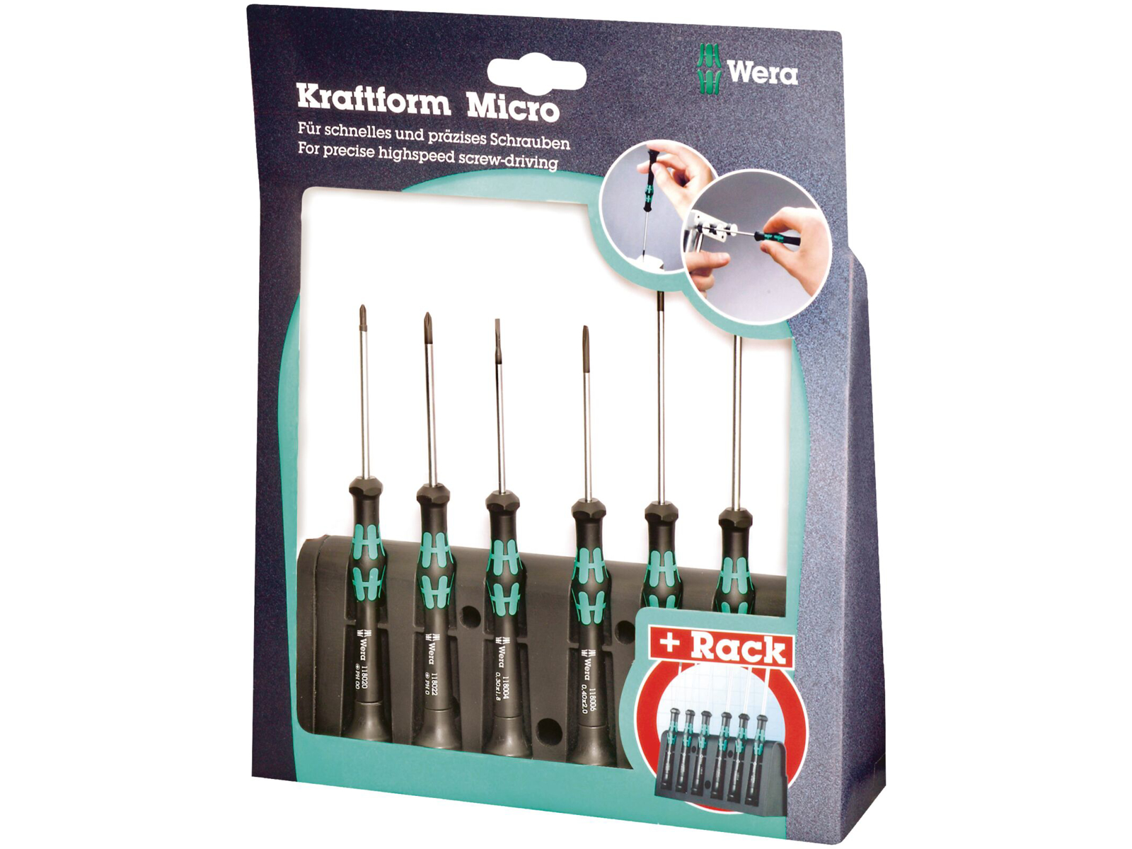 WERA Kraftform-Micro elektronik skruetrækker sæt, lige kærv og Phillips, 6 stk. og rack.