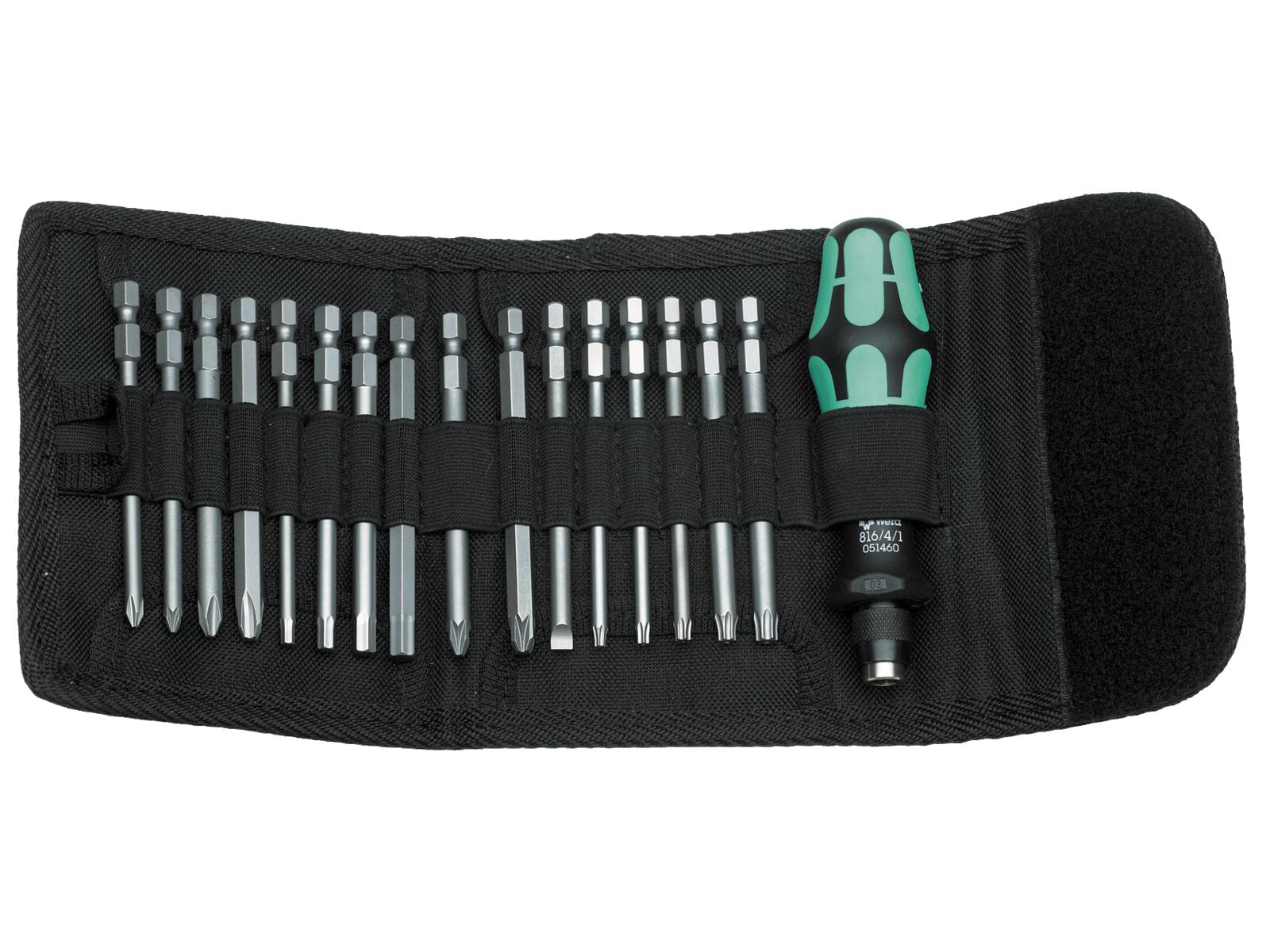 WERA Kraftform Kompakt sæt 17 dele. 1 håndgreb 816R Kraftform med Rapidaptor hurtigskift i foldetaske med 16 stk 89 mm lange bits.