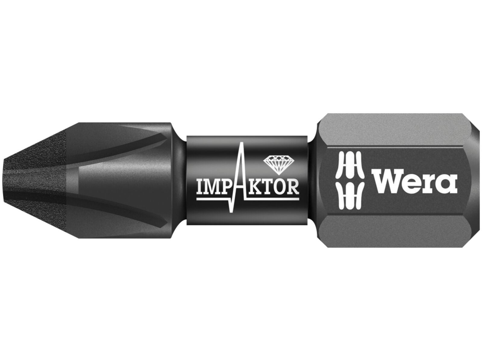 WERA Bits IMP til Phillips skruer. Impaktor-teknikken sørger via den bedst mulige udnyttelse af materialeegenskaberne og via optimalt tilpasset geometri for en holdbarhed over gennemsnittet, også når der stilles ekstreme krav, særligt egnet til brug i almindelige impakt-/slagskruemaskiner, den ru diamantbelægning med forøget friktion nedsætter risikoen for at smutte ud af kærven.