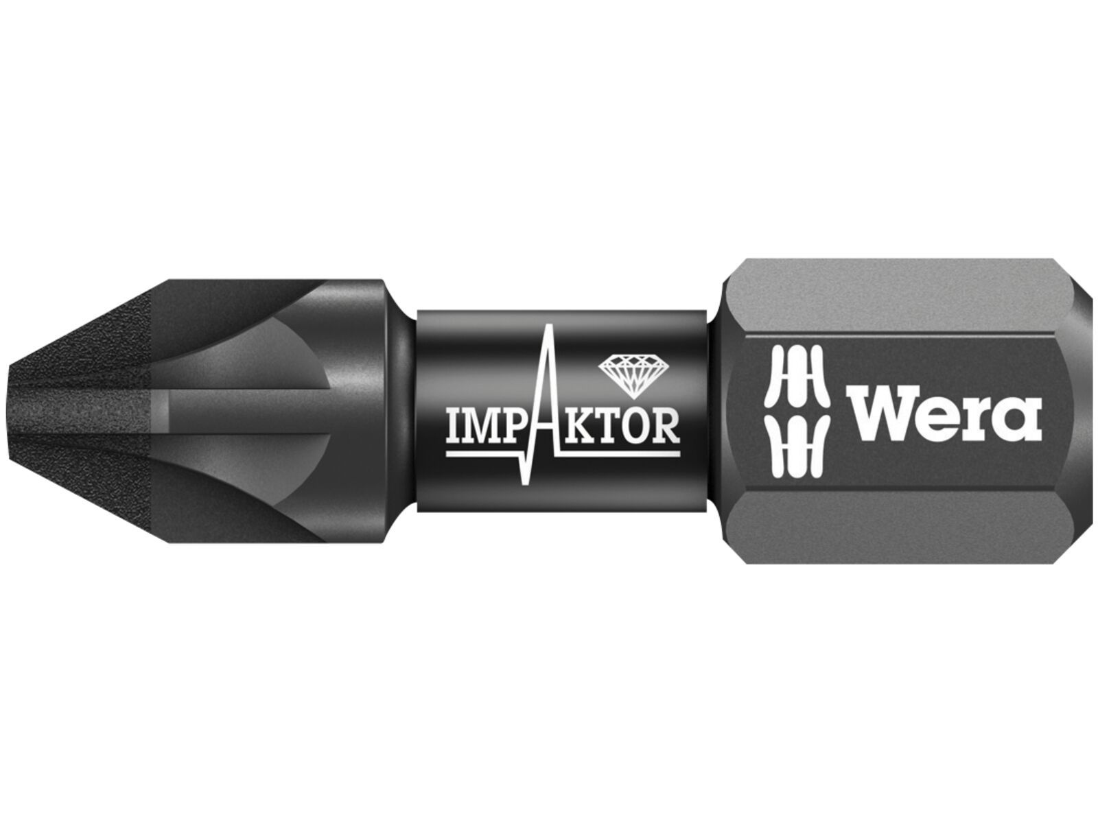 WERA Bits IMP til Pozidrive skruer. Impaktor-teknikken sørger via den bedst mulige udnyttelse af materialeegenskaberne og via optimalt tilpasset geometri for en holdbarhed over gennemsnittet, også når der stilles ekstreme krav, særligt egnet til brug i almindelige impakt-/slagskruemaskiner, den ru diamantbelægning med forøget friktion nedsætter risikoen for at smutte ud af kærven.