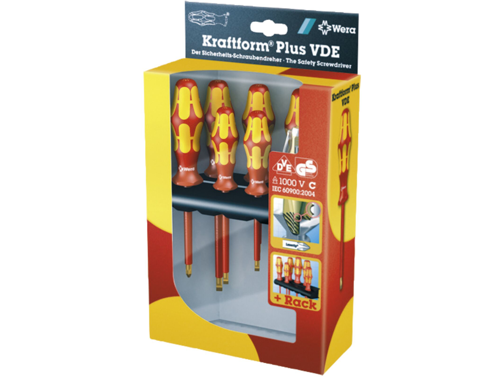 WERA Kraftform-Plus skruetrækker sæt i serie 100 VDE, med 4 lige kærv, 2 pozidrive, 1 polsøger og rack.
